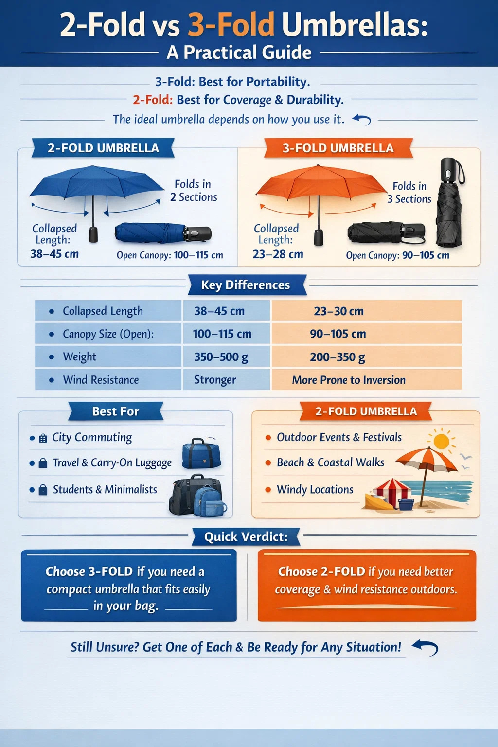 あなたは海岸の近くに住んでおり、強い海風に定期的に対処しており、ビーチや遊歩道に歩くときに日傘としても使用できる傘が必要です。 最良の選択: UPF 50 キャノピー付き 2 つ折り。 風をよりよく処理し、より多くの体をカバーし、UPF 生地が意味のある日焼け止めを提供します。ビーチを完全に日陰にしたい場合は、専用のビーチ パラソルまたはポップアップ シェルターを追加してください。