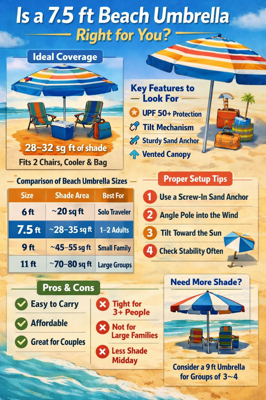 短い答え: 7.5フィートのビーチパラソルが市場で最も人気のあるサイズであるのには十分な理由があります。 — およそ 28 ~ 32 平方フィートの日陰エリアをカバーします。これは、誰も直射日光に当たることなく、ビーチ チェア 2 脚、クーラーボックス、バッグを置くのに十分な広さです。一人で買い物をする場合、またはカップルで買い物をする場合は、7.5 フィートのキャノピーが携帯性と実用的なカバー範囲の間の最適な位置にあります。 3 人以上のグループの場合は 9 フィートのオプションを検討することをお勧めしますが、ほとんどのビーチ旅行では 7.5 フィートが最適です。