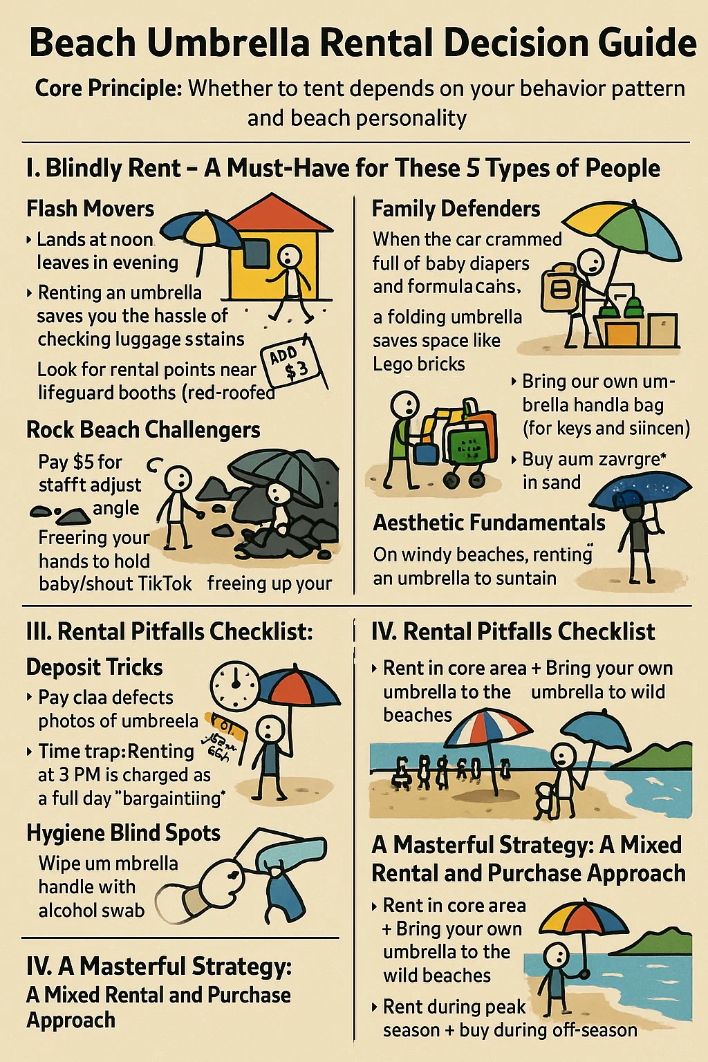 耐風スナイパー: 風の強いビーチで傘をレンタルすることは、麺のような傘をレンタルするようなものです。 → 潮風に耐えられるよう、軍用グレードのグラスファイバー傘をご持参ください。