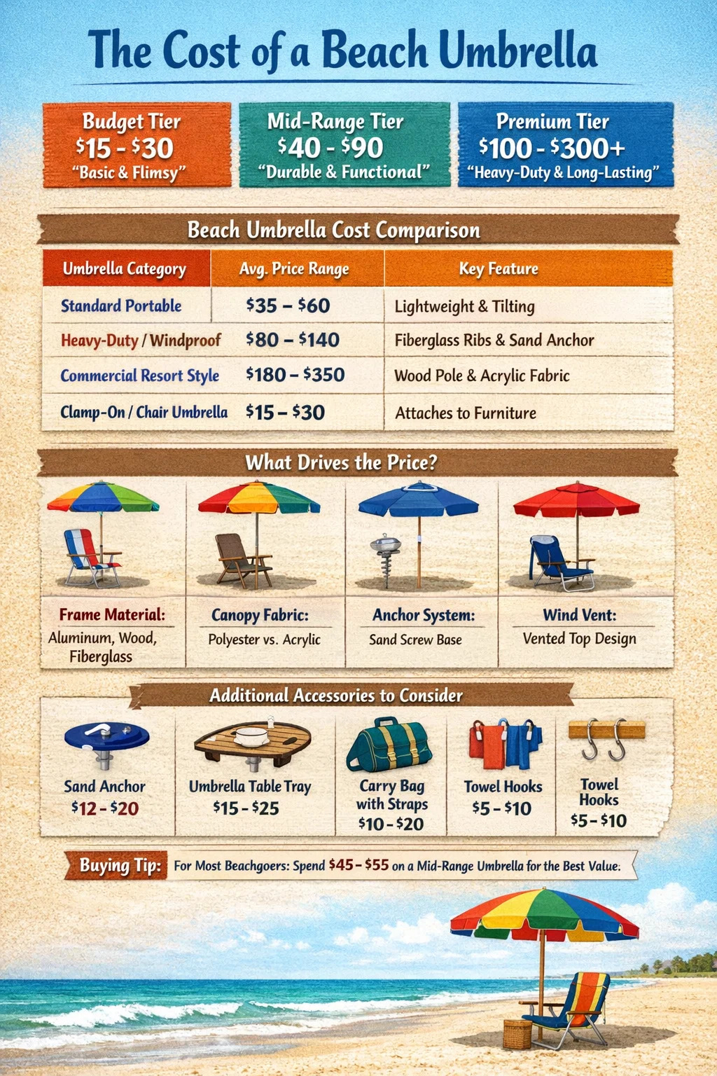 海岸に向かうなら、スタンダードで信頼できる ビーチパラソルの価格は通常 35 ドルから 75 ドルの間です 。この価格帯は通常、6 ~ 7 フィートのキャノピー、基本的な傾斜機構、およびシルバーコーティングされた UV 保護裏地を備えたモデルをカバーします。ただし、市場は広いです。初心者レベルの「使い捨て」傘は、地元の遊歩道の店でわずか 4 円から購入できます。 15ドルから25ドル 、一方、強風に耐えるように設計されたハイエンドの商用グレードのシェード構造の価格は、 150ドルから300ドル以上 .