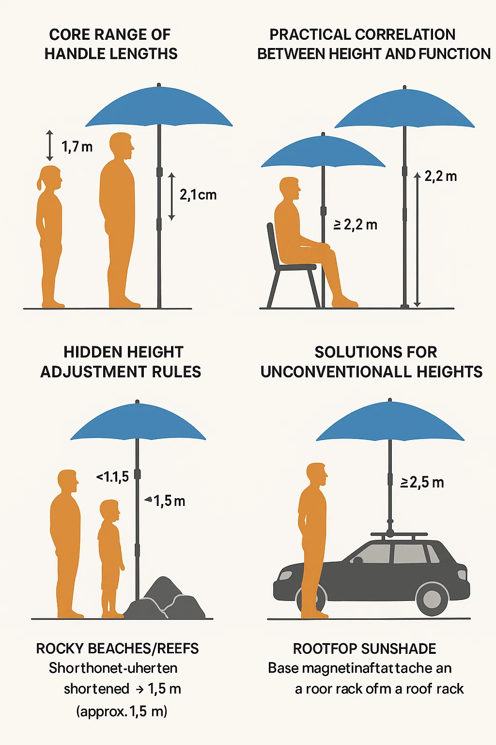 以下は実際的な分析です ビーチパラソル 一般的な使用シナリオと人間工学に基づいた設計原則に基づいた高さ: