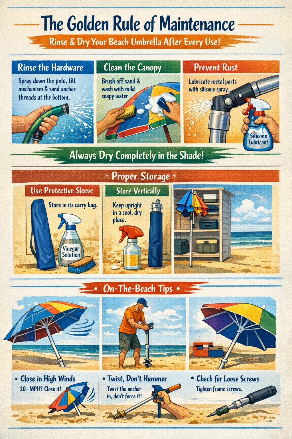 岸から戻ってくると、 ビーチパラソル 微細な塩の結晶と研磨砂で覆われています。放置しておくと、これらの粒子が湿気を閉じ込め、カビや機械的故障の原因となります。