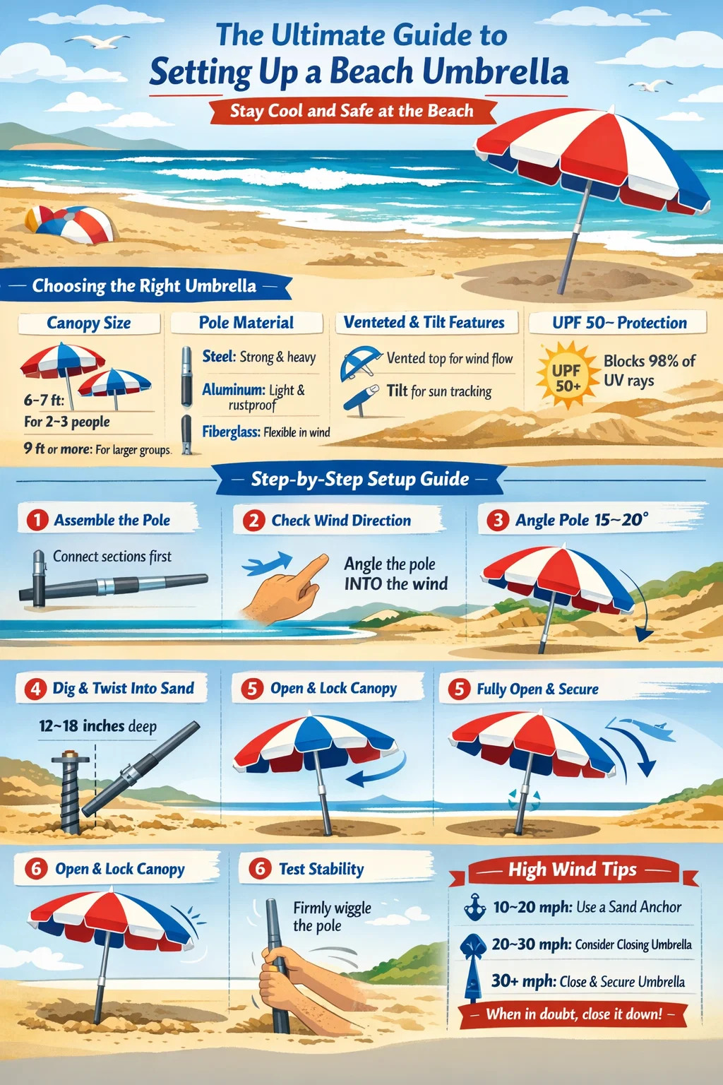 このガイドでは、適切なビーチ パラソルの選び方から、時速 20 マイルを超える突風でもパラソルを安定させるまで、あらゆる手順を詳細に説明しています。これにより、装備と格闘する時間を減らし、より多くの時間を海で楽しむことができます。