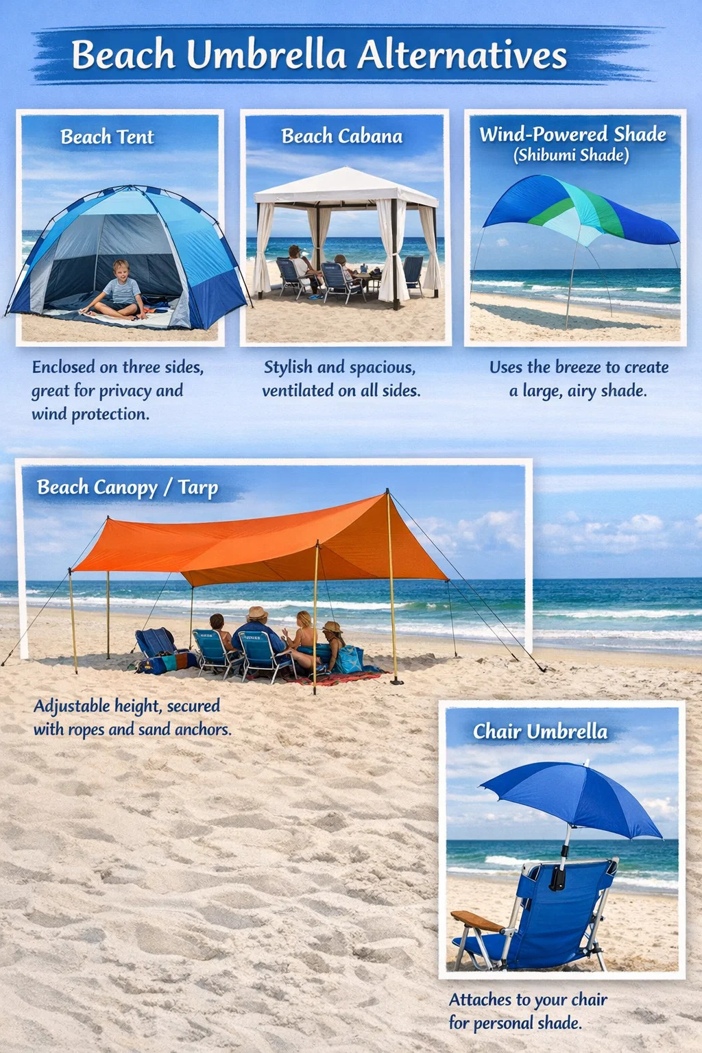 ビーチパラソルの持ち運びや設置が面倒な場合、または風で飛ばされるのが心配な場合は、より大きな日陰のエリアを備えた、より安定した代替品が数多く市販されています。